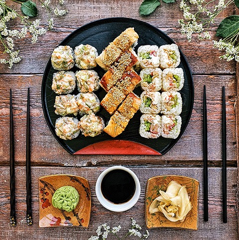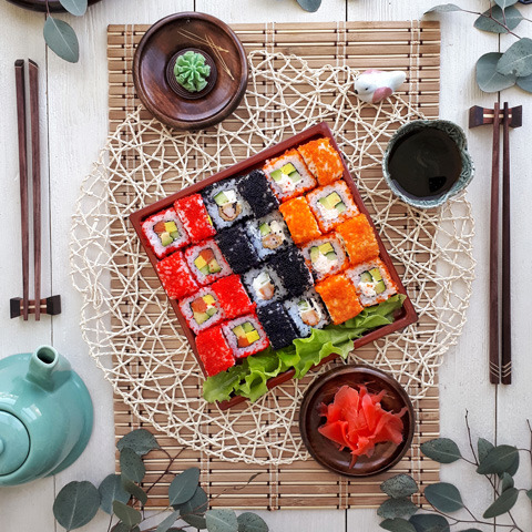Рис, нори, икра масаго, творожный сыр, лосось, гребешок, хоккигай, дайкон, краб, кляр, соус "унаги", соус "сырный", соус "яки", соус "спайс", до 3-х персон. Скидка не действует на сеты, пиццу, чикен, горячие блюда, фастфуд, комбо, напитки, десерты.