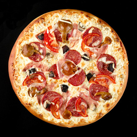 сыр, ветчина, полукопченная колбаса, грибы, помидоры, соус "грибной"