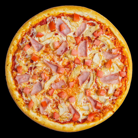 сыр, соус "томатный", куриная грудка, ветчина, помидоры, сыр "моцарелла", соус "сырный"
