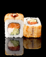 рис, нори, угорь, лосось, огурец, творожный сыр, кунжут, соус "унаги"