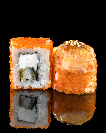 рис, нори, угорь, лосось, креветка, творожный сыр, икра масаго, кунжут, соус "унаги", соус "яки"