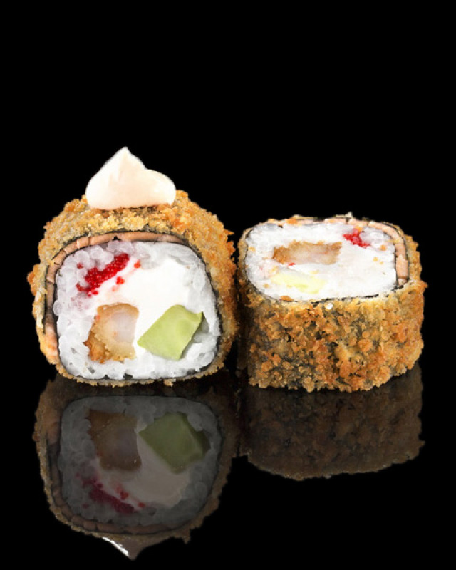 рис, нори, творожный сыр, икра масаго, огурец, креветка, лосось, соус. В комплекте соус "розовый"