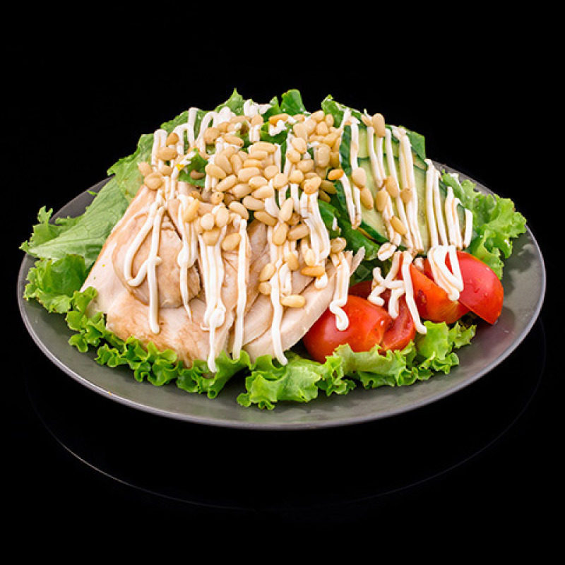 листья салата, куриная грудка, огурцы, салат "айсберг", помидоры, кедровый орех, майонез, соус "бальзамик"